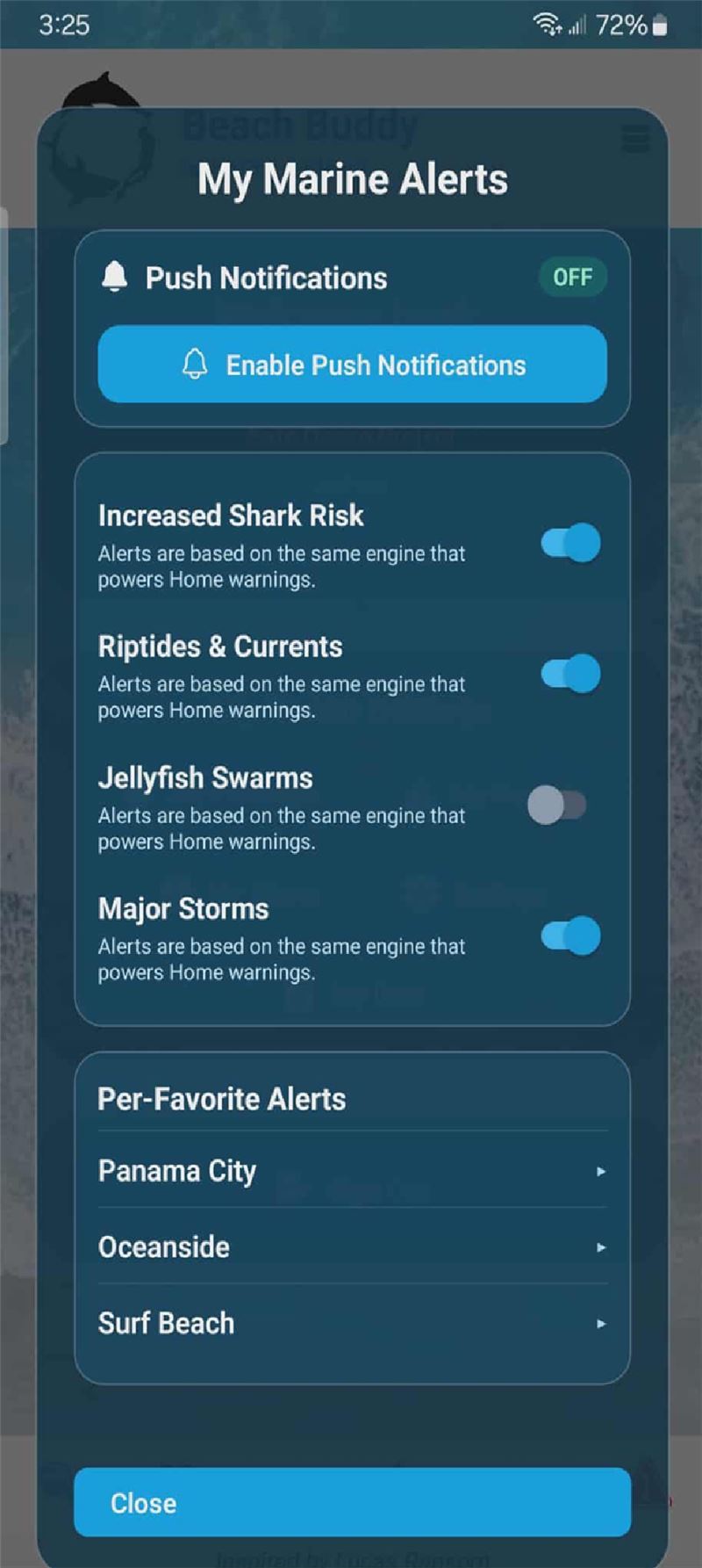 Beach Buddy also supports community-oriented safety through the concept of favorite-beach monitoring and alerting. When a user saves locations, the app is structured to help them stay aware of changing conditions and nearby risk signals relevant to those beaches. The goal is to reduce preventable incidents by consolidating data into a format that is easy to check quickly and interpret correctly.